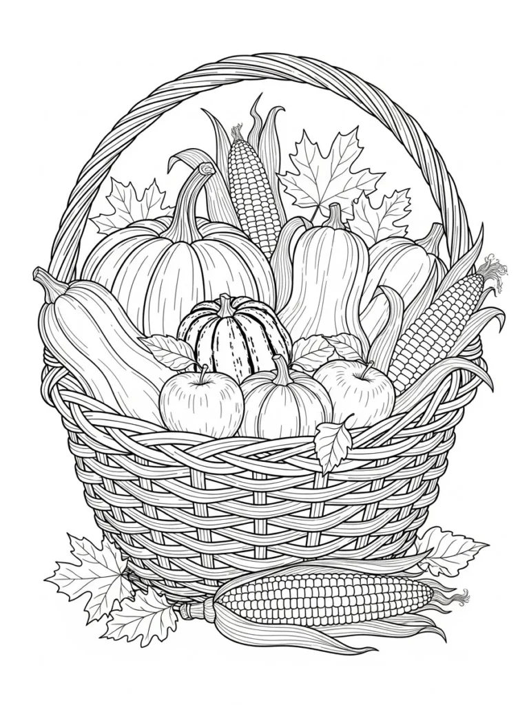 This lovely design focuses on a large, heavily textured woven basket overflowing with the best of the fall harvest. The handle of the basket curves gracefully over the top creating a nice frame for the dense filling. Inside you can spot a variety of pumpkins and squashes showing off different shapes and textures like the ribbed centerpiece pumpkin. We also see lovely details like ears of corn tucked in between the gourds and a few classic maple leaves peeking out. The weaving pattern of the basket is particularly well-detailed offering a wonderful texture challenge when coloring.