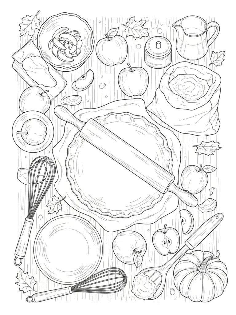 This charming overhead view captures all the delightful chaos of making a classic Thanksgiving dessert laid out on a rustic wooden surface. The central focus is a pastry circle ready for filling, dramatically crossed by a wooden rolling pin. Surrounding this main event are all the essential ingredients and tools like a sack of flour, a pitcher of liquid, whole apples, a bowl of apple slices, two wire whisks, and a small pumpkin resting next to a spoonful of filling. A few scattered leaves suggest the warm, breezy weather outside while we are busy baking inside. The line work is clean and even across all the objects giving it a very organized yet inviting look.