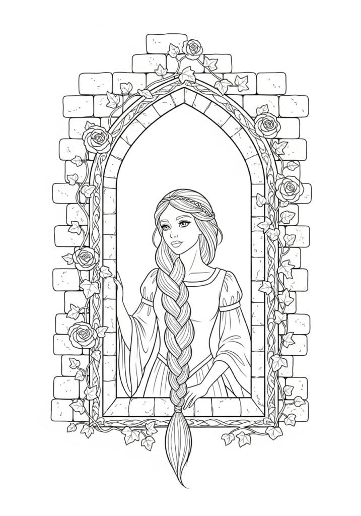 This enchanting coloring page features a princess with an impossibly long braided hairstyle standing gracefully within an arched stone window. The architectural frame is absolutely stunning, with brick-textured stones forming the archway and ornate climbing vines weaving up both sides. Delicate roses bloom at intervals along the flowing vines, while ivy leaves fill in the spaces between. The princess herself wears a medieval-style gown with gathered sleeves and an empire waist, her serene expression and flowing braid creating a focal point that draws your eye right to the center. The line work throughout is clean and detailed without being overwhelming, giving you plenty of intricate areas to work with while maintaining open spaces that won’t make you feel cramped.