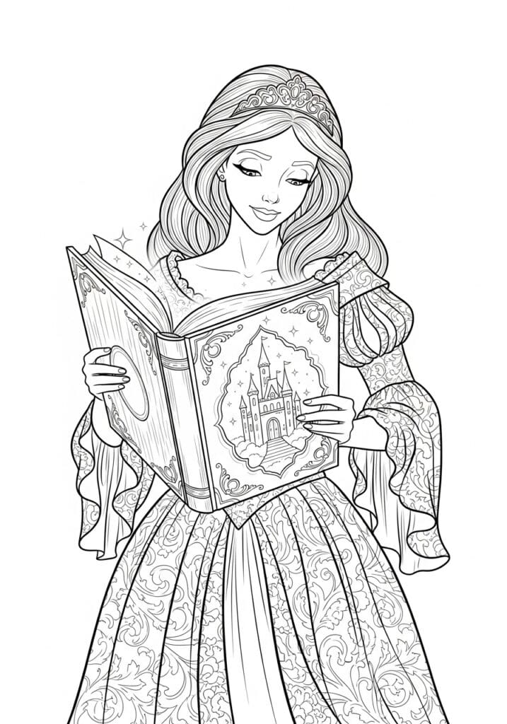 I absolutely adore this page because it celebrates the magic of storytelling and reading in such a charming way. That elaborate swirling pattern covering her entire dress is like a built-in meditation exercise, and I find myself getting completely lost in following those curves and flourishes as I color. You can create such beautiful effects by using different shades of the same color family throughout those swirls, making the pattern pop without being overwhelming. The book is genuinely fun to color because you get to decide what colors to use for the castle illustration. Maybe you want to make it look like an actual book illustration with muted tones, or perhaps you’d rather make that castle sparkle with fantasy colors that glow against the page. The striped corset panel offers a nice contrasting texture to all those organic swirls, giving your eyes a little break while still keeping things interesting. What I really love is how this page has such a cozy, intimate feeling despite all the elaborate detail. She’s not at a ball or on some grand adventure, she’s just enjoying a quiet moment with a good book, which feels so relatable and peaceful. It’s the perfect page to color while you’re curled up with your own book or podcast, creating this lovely meta moment of quiet creativity.