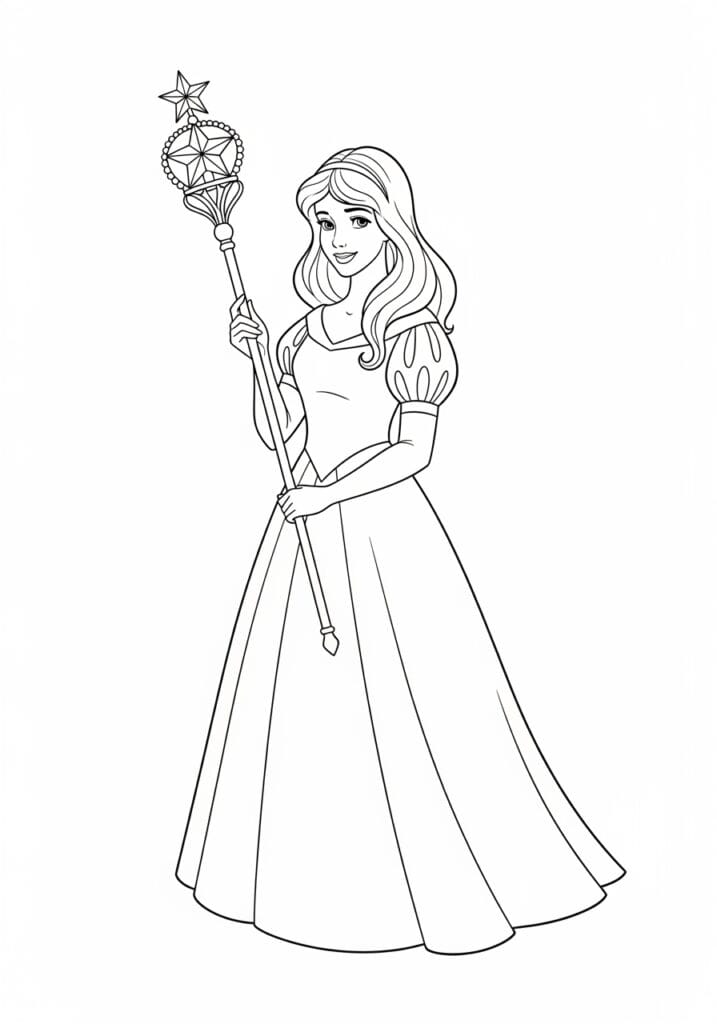 This page has such a sweet, classic storybook feel that reminds me of all my favorite princess movies growing up. The large open areas in that gorgeous skirt are absolutely perfect for trying out blending techniques or creating soft gradient effects that make the fabric look like it’s catching light. I always love pages with magical wands because that ornamental topper gives you the perfect excuse to break out metallic gel pens or glitter markers if you have them. Those geometric patterns on the wand sphere are detailed enough to be interesting but not so tiny that they’ll drive you crazy. The puffed sleeves are great for practicing dimensional shading to make them look properly three-dimensional and puffy. Her flowing hair offers wonderful opportunities for creating highlights and depth with layered colors. What I really appreciate about this page is its elegant simplicity. There’s no complicated background competing for attention, so you can really focus on making the princess herself look absolutely magical. You can go traditional with royal purples and golds, or create a completely unique color story with unexpected combinations. The clean composition means this page works up relatively quickly compared to more detailed designs, which makes it perfect for when you want that satisfying feeling of completing something beautiful without committing to hours of intricate work.