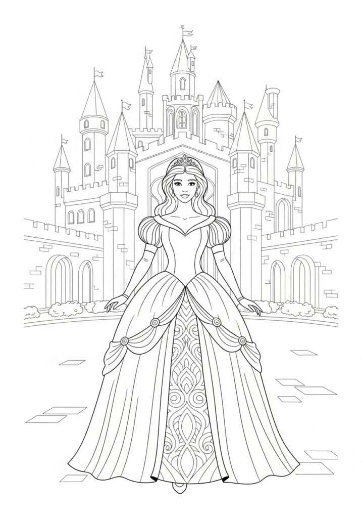 What I really love about this page is how it gives you two completely different coloring experiences in one design. The castle background is perfect for when you want something rhythmic and calming, just working through all those towers and windows with shades of gray and cream, maybe adding some sunset colors peeking through. Then you’ve got that gorgeous gown front and center, which is where you can really let loose with your favorite colors. That ornamental panel is like a little mandala bonus tucked into the dress, and I always find myself reaching for my best markers when I get to sections like that. The princess has this regal but approachable expression that makes the whole scene feel both fancy and fun. You can go traditional with royal purples and golds, or make her the ruler of a pastel kingdom with soft pinks and mint greens. The composition is so well balanced that your eye naturally moves from the detailed dress up to the impressive castle, making the whole coloring experience feel really satisfying from start to finish.
