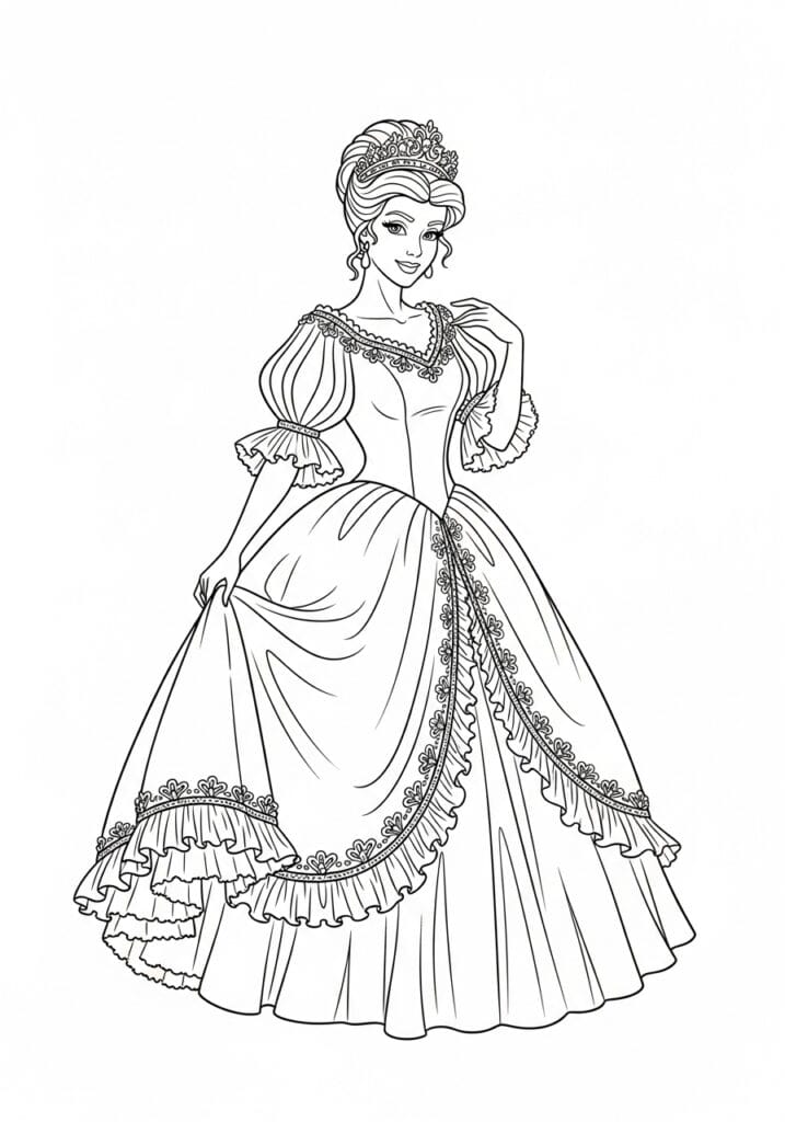 This page is honestly a ruffles lover’s absolute dream come true. Those layered tiers on the skirt are so satisfying to color because each ruffle layer gives you a chance to play with light and shadow, making them look dimensional and realistic. I find myself getting into this wonderful meditative state when coloring repetitive elements like ruffles because there’s something about the rhythm that’s just deeply calming. The ornamental trim running across the gown is perfect for breaking out fancy techniques like stippling or cross-hatching if you’re using colored pencils, or trying your hand at creating embroidered effects with gel pens. That elaborate updo with the ornate tiara offers a nice contrast to all the flowing fabric, giving you a chance to work on something more structured. The puffed sleeves are great for practicing those fabric fold shadows that make clothing look three-dimensional rather than flat. What I love most about this page is how it manages to be incredibly detailed without feeling overwhelming. Yes, there are a lot of ruffles, but they’re organized in a way that makes sense visually, so you can tackle one section at a time. You could easily spend multiple coloring sessions on this one, working on different areas each time, or power through it in one epic session if you’re really in the zone. Either way, the finished result is going to look absolutely stunning and worthy of framing.