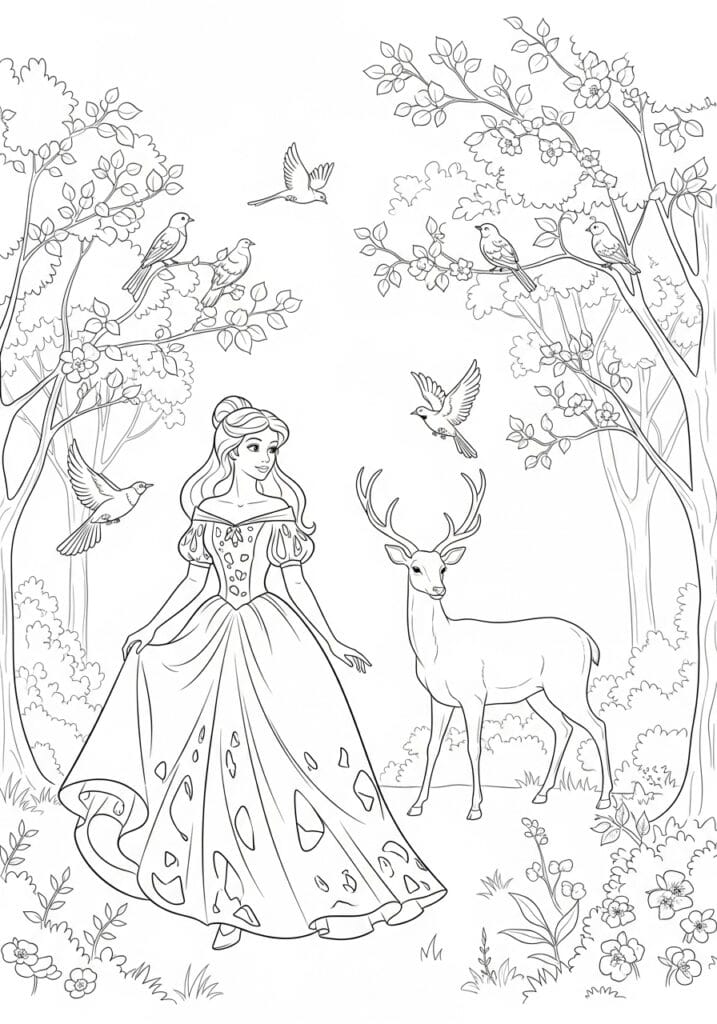 This dreamy coloring page transports you straight into a magical woodland scene where a princess encounters a gentle deer in a sun-dappled forest clearing. The princess wears a stunning gown with puffed sleeves and a fitted bodice decorated with a lovely pattern of small leaf or teardrop shapes, while her flowing skirt features scattered leaf motifs that echo the natural setting around her. A delicate tiara adorns her wavy hair, and she stands gracefully beside a regal deer with impressive antlers. The forest backdrop is absolutely bursting with life, featuring flowering branches overhead, multiple songbirds perched and flying throughout the scene, fluffy clouds of foliage, and a carpet of wildflowers and grass at ground level. The trees frame both sides of the composition beautifully, with detailed branches, individual leaves, and small blossoms creating layers of depth. The line work varies nicely between the finer details of the flowers and birds to the bolder outlines of the main characters, giving you plenty of variety to work with.