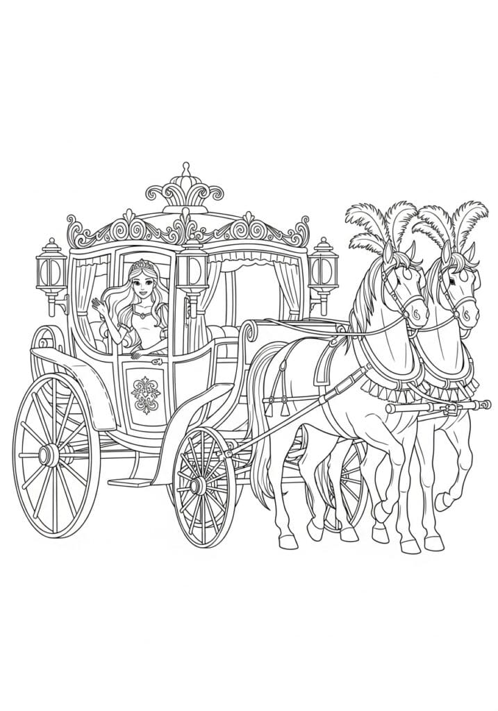 This fairytale coloring page captures the ultimate Cinderella moment with an ornate royal carriage pulled by two magnificent horses sporting fabulous feathered plumes. The carriage itself is an absolute dream, featuring elaborate scrollwork along the top, decorative lanterns mounted on posts at each corner, draped curtains framing the windows, and intricate medallion details on the door panels. The large spoked wheels have beautiful radiating patterns that add wonderful geometric interest to the curved, flowing lines of the carriage body. Inside one window, a princess waves graciously, wearing a tiara and necklace. The two horses are perfectly matched and beautifully detailed, with flowing manes and tails, decorative harnesses adorned with tassels, and those show-stopping feathered headdresses that scream royal procession. The composition is nicely balanced with the horses on the right and the carriage taking up the left side, while ornate flourishes crown the top of the carriage in a symmetrical design.