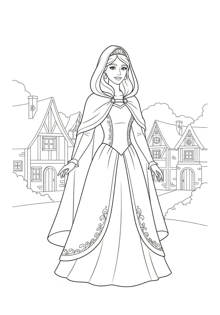 I find this page really satisfying because it gives you two totally different coloring experiences in one image. The princess herself is perfect for trying out rich jewel tones or soft romantic colors, and those scrollwork details on her gown are just detailed enough to be interesting without making you want to throw your markers across the room. That cape is a dream for practicing color blending and creating fabric texture with your shading. Then you’ve got the village backdrop, which is like a little bonus project that lets you play architect and decide on all the cottage details. You can make them cozy and rustic with warm browns and reds, or go full fairytale fantasy with pastel walls and colorful roofs. The timber frame patterns give you built-in guidelines for creating wood grain effects if you’re into that level of detail. The smoke from the chimneys and those fluffy clouds add such a peaceful, lived-in feeling to the whole scene. This is one of those pages that feels really complete when you’re done because you’ve essentially colored both a character study and a mini landscape, which always gives me that extra sense of accomplishment.