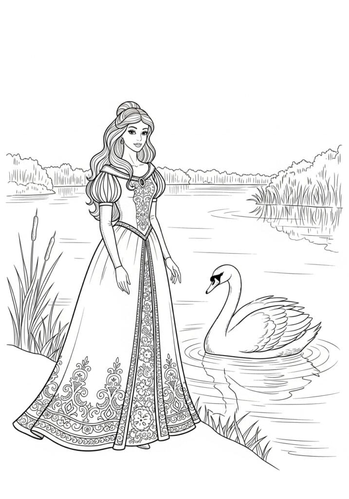 This page is honestly a coloring meditation waiting to happen. That ornamental border on her dress is like having a mini mandala session built right into the design, and I could easily spend an entire evening just working through those swirls and flowers with different shades of the same color family for an ombre effect. The swan gives you a perfect opportunity to practice subtle shading techniques to make those feathers look dimensional and realistic, or you could go totally fantastical and make it a fantasy swan with iridescent colors. The water ripples are surprisingly therapeutic to color because they’re detailed enough to be interesting but repetitive enough to zone out with. The lake background lets you set whatever mood you want for the scene, from a misty morning with cool grays and soft blues to a golden sunset with warm peachy tones reflected in the water. The cattails and reeds add just enough natural elements to ground the whole composition. What I love most is how this page balances intricate detail work with larger open areas, so you never feel overwhelmed but you also never run out of interesting bits to color.