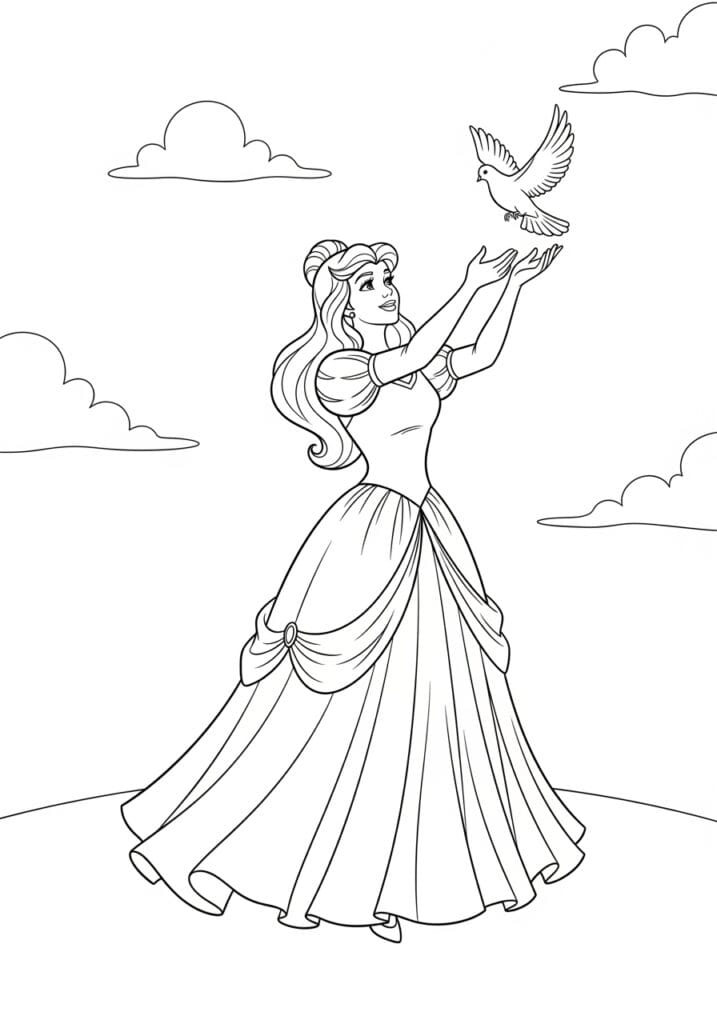 This uplifting coloring page captures a moment of pure magic as a princess reaches upward to release a dove into flight. The composition is wonderfully open and airy, with fluffy clouds scattered across the sky creating a dreamy atmosphere. The princess wears an elegant gown with a fitted bodice featuring decorative bands at the sleeves and a gorgeously draped skirt that flows outward with beautiful movement. Her skirt includes a charming swag detail on one side held by an ornamental brooch, while the hem features those satisfying curved panels that add dimension and flow to the fabric. Her hair is styled in a romantic half-up look with flowing waves cascading down her back. The dove above her outstretched hands is beautifully detailed with individual wing feathers that create a sense of motion as it takes flight. The simple sky background keeps the focus entirely on this touching moment between princess and bird, with just enough clouds to frame the scene without cluttering it.