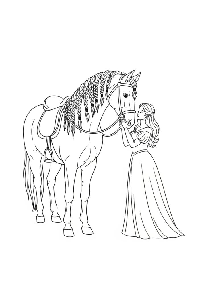 This tender coloring page showcases a beautiful moment between a princess and her magnificent horse with an elaborately braided mane. The horse is absolutely stunning, featuring multiple thick braids flowing down its neck in a gorgeous cascading pattern that any hairstylist would envy. The horse wears a decorative bridle and is fitted with an elegant saddle complete with a stirrup, all rendered with clean lines and realistic detail. The princess stands beside her noble companion in a flowing medieval-style gown with a fitted bodice accented by a belt at the waist and wide flowing sleeves. Her long wavy hair is adorned with a simple circlet or headband, and she gazes affectionately at the horse while holding its reins. The horse’s muscular form is beautifully depicted with subtle shading lines that define its legs and body, while its long flowing tail mirrors the braided mane. The composition is elegantly simple with no background distractions, allowing you to focus entirely on the bond between princess and steed.