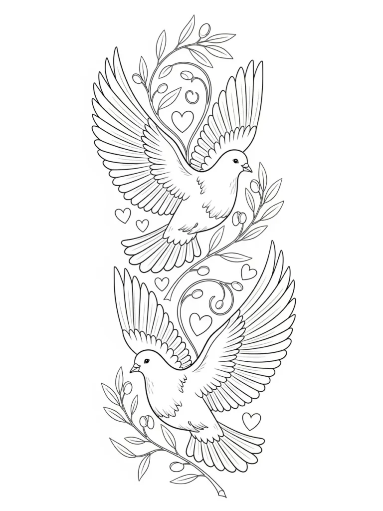This coloring page features two graceful doves in mid flight, arranged in a tall flowing layout that feels soft and romantic. Their wings are spread wide with layered feathers drawn in clean, fine lines that invite careful coloring. Delicate leafy branches curl around the birds, weaving through heart shapes and gentle swirls that add movement without feeling crowded. The symmetry feels balanced yet organic, and the thin black line art keeps everything elegant and detailed, perfect for an adult Valentine themed page.