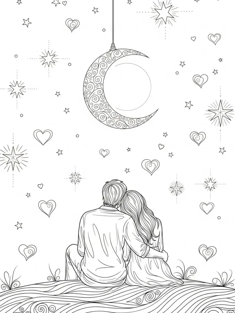This coloring page shows a couple sitting close together beneath a hanging crescent moon surrounded by stars hearts and dreamy night sky details. The scene is calm and romantic with flowing lines in the ground gentle patterns in the sky and a beautifully decorated moon filled with swirling designs. The couple is drawn from behind which gives the moment a quiet intimate feel and lets the surrounding details shine. Fine clean lines keep everything elegant while still offering enough detail to make coloring slow and enjoyable.