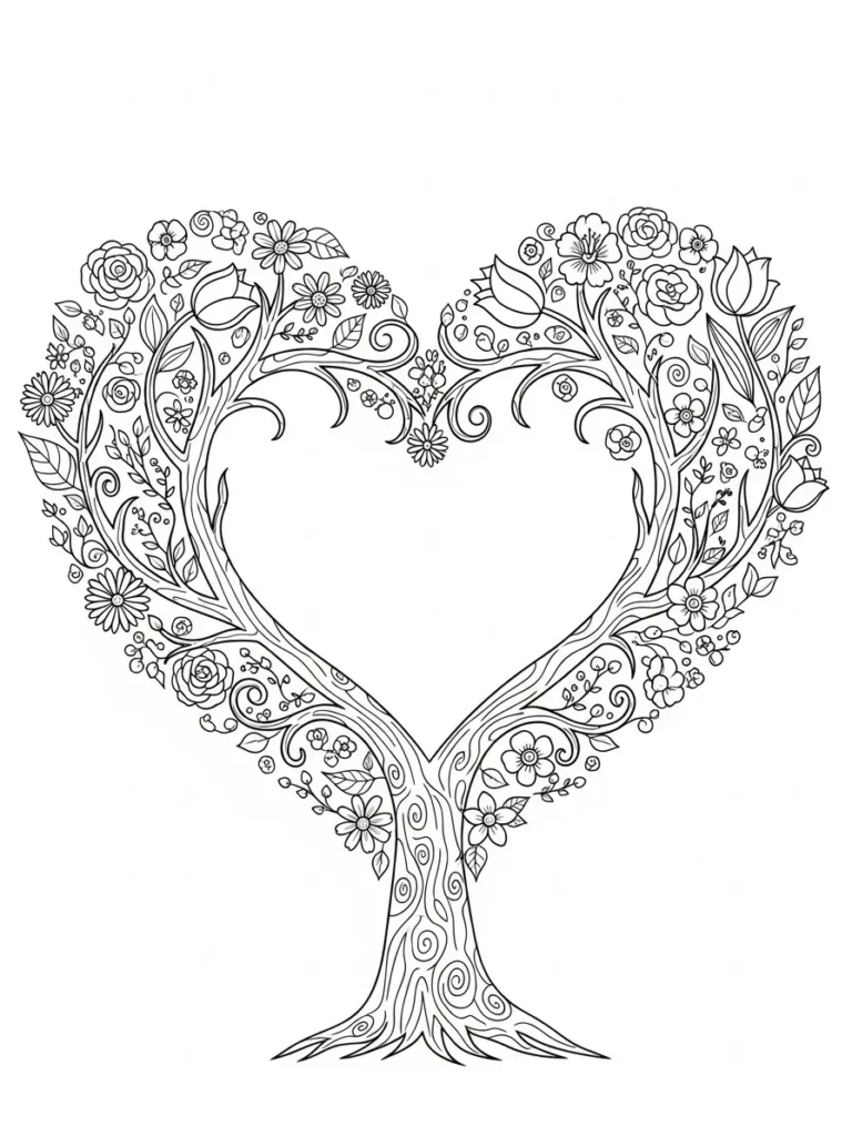 This coloring page features a whimsical tree whose branches curve gracefully into a large heart shape filled with flowers leaves and swirling vines. The trunk flows upward with organic lines and gentle patterns that connect beautifully into the heart canopy. Roses daisies and small blossoms are tucked throughout the branches creating a soft romantic balance between nature and symbolism. Fine clean lines keep the design elegant and detailed while leaving open spaces that make coloring feel calm and enjoyable.