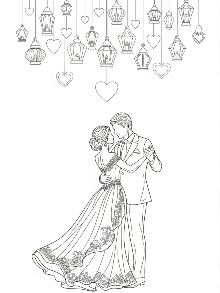 This coloring page captures a graceful couple sharing a slow dance beneath hanging lanterns and floating heart decorations. The flowing gown is detailed with delicate patterns along the hem and bodice while the suit stays clean and classic for balance. Above them the lanterns hang at different heights creating a romantic atmosphere and soft movement in the scene. Fine smooth lines keep the design elegant and refined with plenty of space to enjoy shading fabric and gentle background accents.