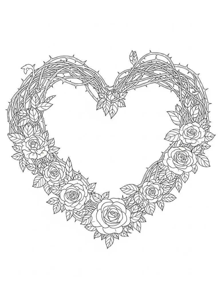 This coloring page features a large heart shape formed entirely from twisting vines blooming roses and layered leaves. The heart outline feels organic and slightly wild with thorny branches weaving together at the top and fuller clusters of roses along the sides and bottom. Each rose is detailed with soft petal layers and clean fine lines that give plenty of room for shading. The open center keeps the layout airy while the detailed border makes the design feel rich and romantic without being too busy.