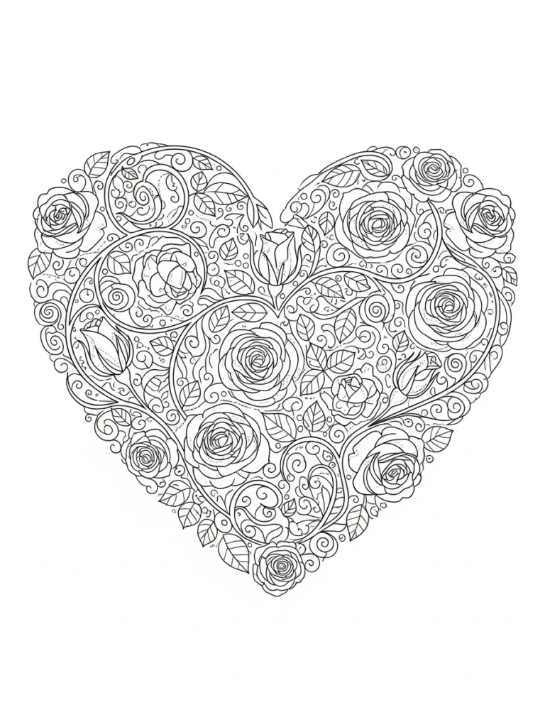 This coloring page features a full heart shape made entirely from blooming roses curling vines and soft leafy details. The design is rich with swirling patterns that weave between each flower creating a sense of movement and depth throughout the heart. Each rose is drawn with layered petals and fine clean lines that give plenty of room for shading and color play. The overall layout feels balanced and elegant with the heart standing beautifully on its own against a clean background.