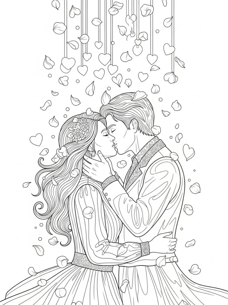This coloring page captures an intimate moment between a couple sharing a gentle kiss surrounded by floating hearts and softly falling flower petals. Long flowing hair detailed clothing folds and expressive facial lines give the scene a dreamy romantic feel. Thin clean line work keeps everything elegant while still offering plenty of detail in the hair fabric and background elements. Hanging heart strings above add a whimsical Valentine touch and help frame the couple in a tall graceful layout.