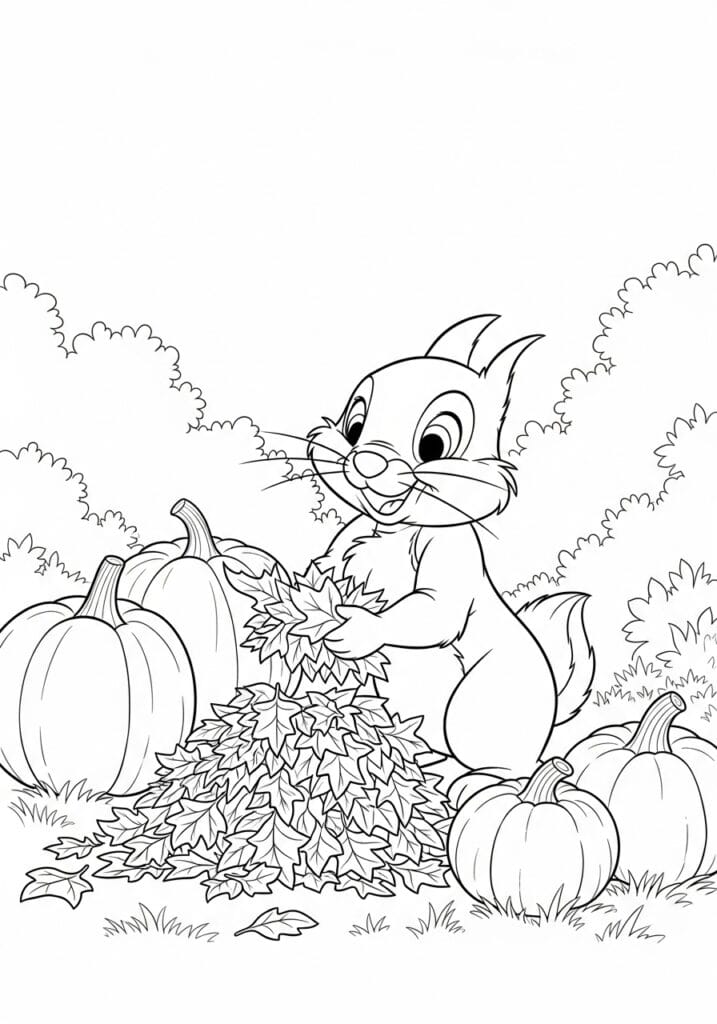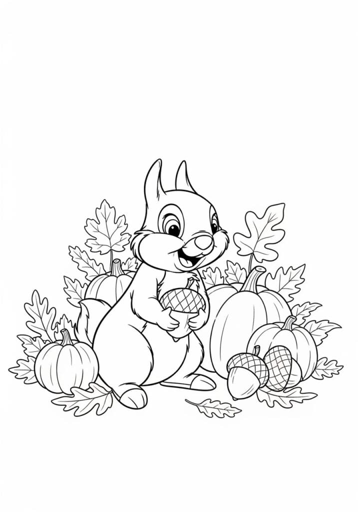 A Disney Squirrel Hugging an Acorn Among Fall Pumpkins and Leaves