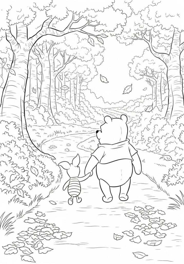 This page genuinely made me a little emotional when I first looked at it properly and I am not even slightly embarrassed about that. There is something about seeing two best friends walking into an autumn forest together from behind that just hits differently, and I think that quiet sense of friendship and seasonal peace makes this the most meaningful coloring experience in the whole set. I love that Pooh and Piglet are relatively simple to color which lets you really pour your energy into that spectacular forest around them, building up layers of golden yellows, warm ambers, and rich russets through all those beautiful trees. The path itself is a wonderful element to work on, and using lighter tones in the far distance to create that misty forest depth is one of my favorite coloring techniques of all time.