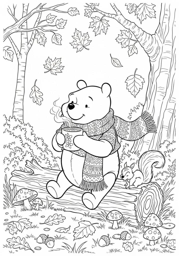 This page is pure cozy magic from top to bottom and I genuinely think it might be my favorite in the entire collection. Pooh is perched contentedly on a mossy fallen log, wrapped in the most gorgeous patterned scarf and sweater combo, cradling a steaming mug with the most peaceful little expression on his face. A tiny squirrel sits right beside him on the log, which is just the most adorable detail. The forest around him is incredibly rich and layered, with tall birch trees framing the scene, maple leaves raining down through the air, spotted mushrooms of different sizes dotting the ground, and acorns and oak leaves scattered across the forest floor. The linework is where this page really shines though, because Pooh’s scarf and sweater are covered in the most intricate geometric and zigzag patterns that look like a proper fair isle knit, giving you some seriously beautiful detail work to get into.