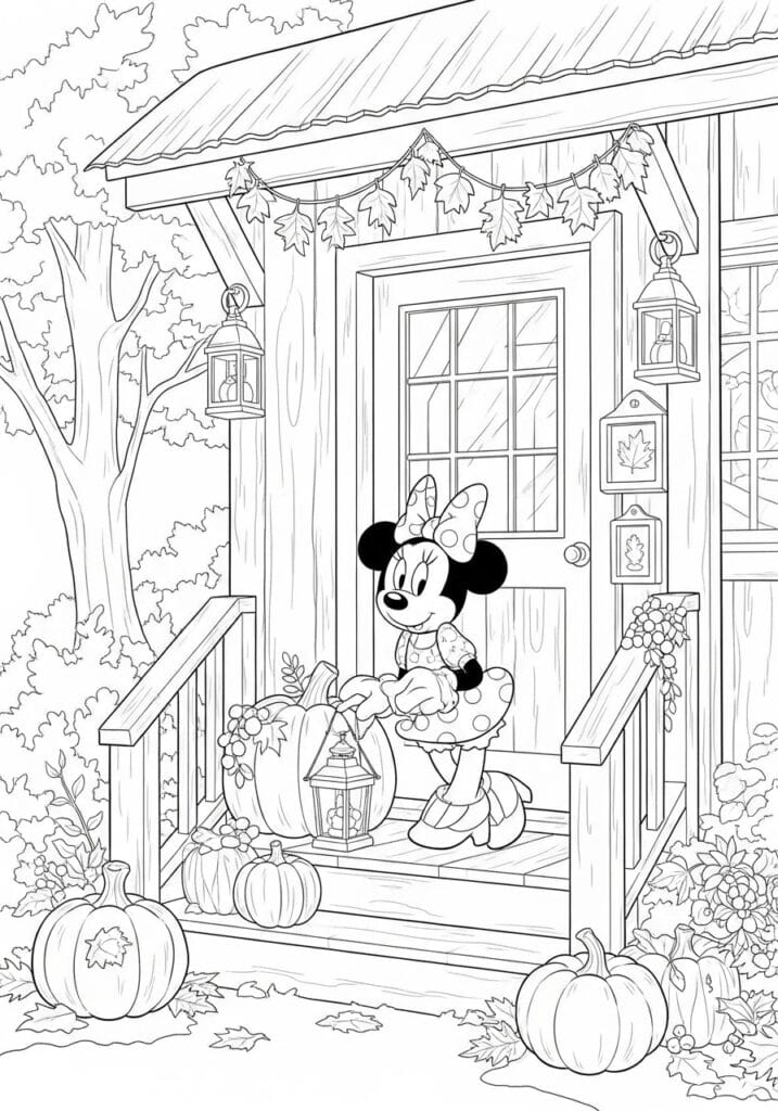 This page genuinely feels like coloring a dream autumn Pinterest board come to life and I could not love it more. The wood grain texture alone across the cottage walls and porch is something I could happily work through for a long time, experimenting with warm honey tones and rich browns to make it feel really lived in and real. Minnie’s polka dot dress is always a little moment of joy to color, and I love deciding whether to keep her in her classic red or switch things up with a deep plum or forest green for a more seasonal twist. The lanterns are such a lovely detail too because you can make them glow with warm golden yellows and ambers that really make the whole scene feel lit from within. This is a rich, rewarding page with so much personality in every single corner.
