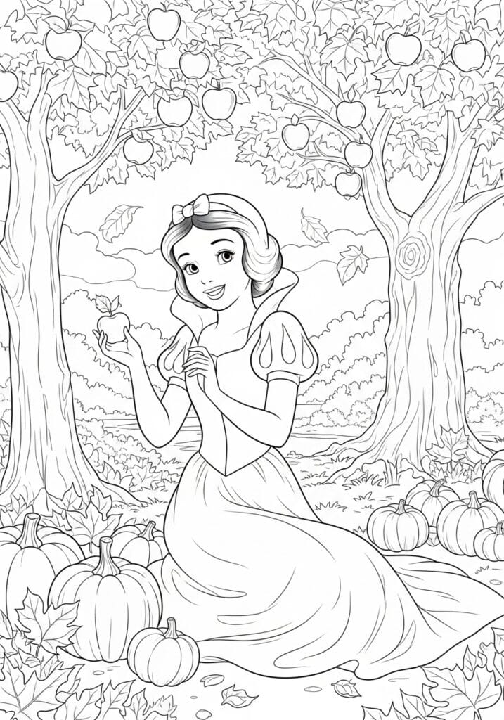 This scene has such a beautiful storybook quality to it that I genuinely stopped and admired it for a moment before even thinking about colors. Snow White is seated gracefully on the ground between two large apple trees, holding a freshly picked apple and looking absolutely radiant, with pumpkins of various sizes nestled around her in the fallen leaves. The apple trees overhead are absolutely laden with fruit, their branches spreading across the full width of the upper half of the page and creating the most gorgeous natural canopy. A soft rolling landscape with hedges and open sky fills the middle background, adding real depth and airiness to the whole composition. The linework is smooth and elegant throughout, with clean flowing lines on Snow White’s dress and figure contrasting beautifully against the more organic, branching details of the trees and the gently ribbed pumpkins at her feet.