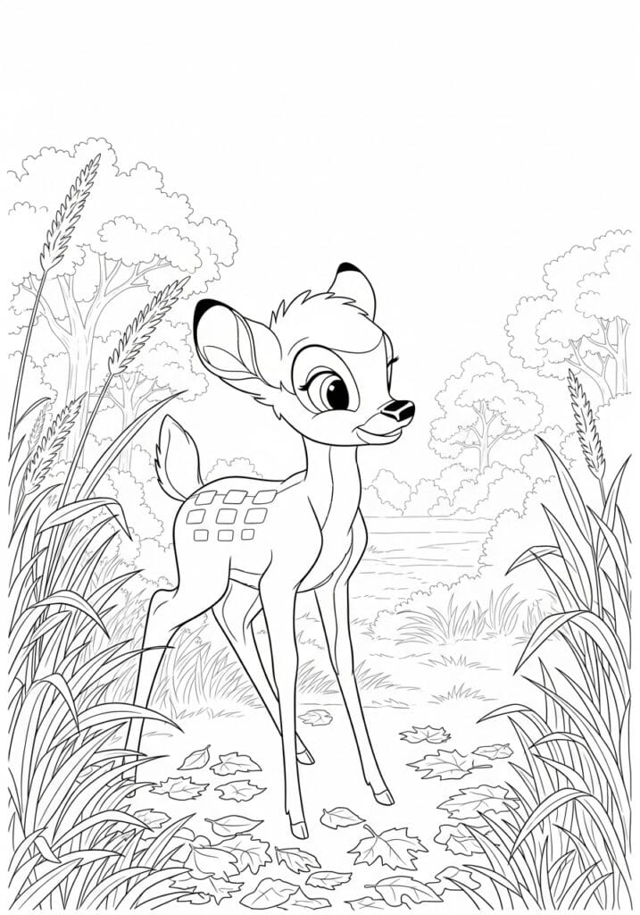 This page has a completely different feel from the other Bambi scene in this collection, and I love how much more open and airy it is. Bambi stands front and center in a peaceful meadow clearing, looking off to one side with those gorgeous big eyes and the sweetest curious expression, surrounded by tall wild grasses and wheat stalks that frame him naturally on both sides. The background opens up into a soft woodland landscape with rounded trees and what looks like a gentle stream or pond in the distance, all rendered in lighter, more delicate linework that keeps the focus firmly on Bambi himself. A scattering of autumn leaves lies across the ground at his feet, and his little spotted back markings are shown as a charming grid pattern detail right in the middle of his body. The overall composition feels spacious and calm, with a generous open sky area at the top that gives the whole page a lovely sense of fresh autumn air.