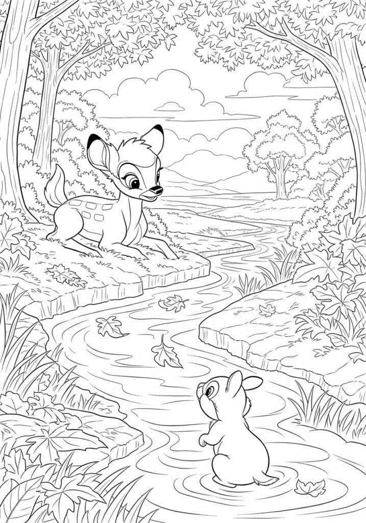 This is the kind of page that makes me want to clear my whole afternoon and just settle in properly because there is so much to enjoy working through. The water is genuinely my favorite element here because creating the illusion of a softly flowing stream with colored pencils or watercolors is such a rewarding little creative challenge, and those gentle ripples around Thumper are just the cutest detail to work with. I love how the scene naturally guides you from foreground to background, getting lighter and airier as you move further into the landscape. The contrast between the rich dark tree trunks framing the top and the soft open sky in the middle creates such a beautiful visual journey across the page. This one is a genuine coloring experience and I mean that in the best possible way.
