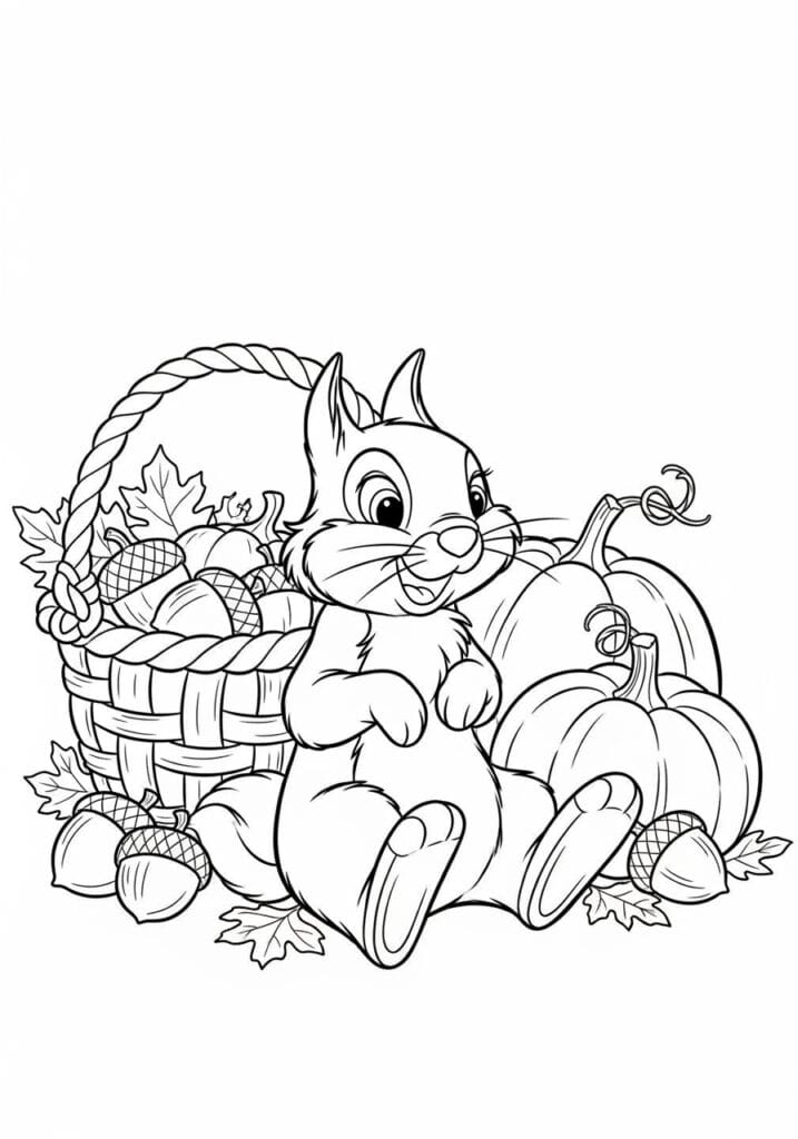 A Disney Squirrel Sitting Between a Harvest Basket and Pumpkins with Acorns