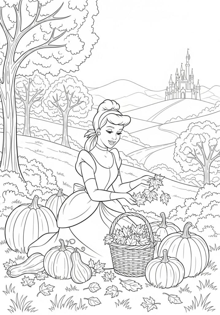 This page is an absolute dream and the background detail alone makes it one of the most special scenes in this whole collection. Cinderella is kneeling gracefully in the foreground, reaching out to catch a falling maple leaf while a woven basket full of collected leaves sits open beside her, surrounded by pumpkins, gourds, and scattered autumn leaves across the grass. Behind her a gorgeous rolling landscape stretches back through layers of autumn trees and hedgerows, and right there on the hilltop in the distance sits her castle, beautifully detailed with its iconic spires reaching up into the open sky. A large bare tree anchors the upper left corner while fuller autumn foliage fills the right side of the background, creating a really lovely sense of natural depth throughout the whole composition. The linework is elegant and well balanced, with clean flowing lines on Cinderella and bolder outlines on the foreground pumpkins that gradually soften as the landscape recedes beautifully into the distance.