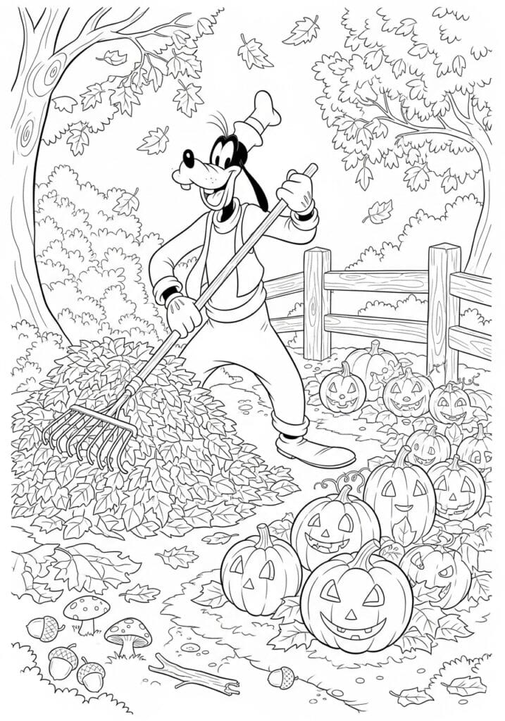 Goofy Raking Autumn Leaves Next to a Crowd of Jack-o-Lanterns