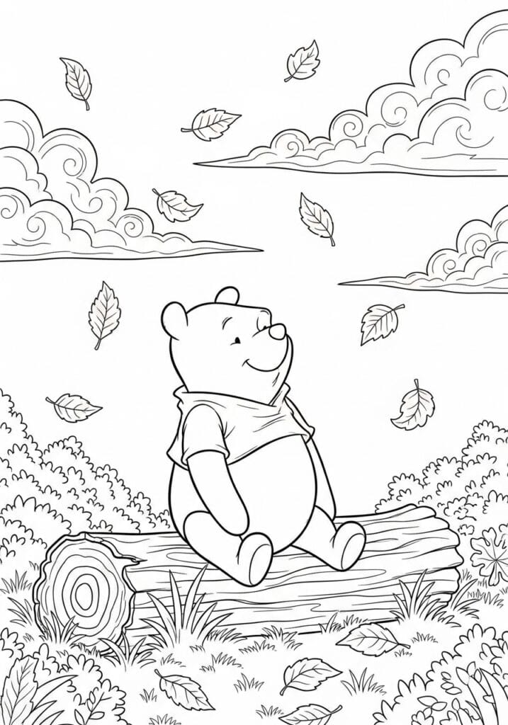 This final page in the collection is the most beautifully simple and serene of all three Pooh scenes, and I saved noticing it properly until the end because it genuinely stopped me in my tracks. Pooh is sitting on a fallen log in his classic red shirt with the most dreamy, peaceful expression on his face, just watching the autumn leaves float gently around him with absolutely nowhere to be and not a care in the world. The sky takes up a generous portion of the upper half of the page and is filled with the most gorgeous decorative swirling clouds that have a lovely stylized quality to them, almost like something from a classic storybook illustration. Leaves of different shapes and sizes drift freely throughout the whole composition from top to bottom, and rounded lush bushes fill the lower sides of the page around the log with lovely organic texture. The linework is clean and unfussy throughout, keeping everything feeling open and calm with bold simple outlines on Pooh and softer more decorative curves on those beautiful swirling clouds.