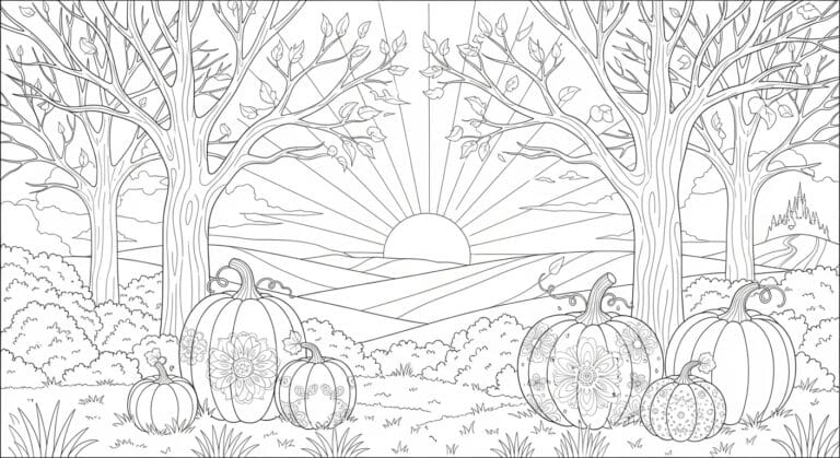 What I love most about this page is how it essentially gives you a little autumn color palette workout all in one cozy scene. The basket weave and rope handle are genuinely some of my favorite things to color because working through that interlocking pattern with warm tans and caramels is so satisfying and almost hypnotic in the best way. The acorns scattered around the base are tiny but mighty in terms of detail, and I always find myself taking extra care with their little caps, using darker shades to make that crosshatch texture really pop. The pumpkins are smooth and generous enough to practice some really lovely blending on, and the whole scene comes together into something that looks genuinely impressive once all those warm autumn tones start filling in around that adorable little face.