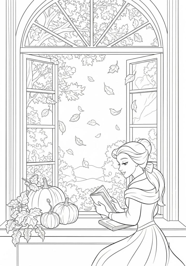 This page genuinely made me stop and just look at it for a moment before I even thought about coloring it, because the composition is so pretty and peaceful. I love that the window creates this natural layering effect where you get to build up a whole autumn landscape in the background while keeping Belle and the foreground details more intimate and detailed. My plan for this one would be to keep the interior tones warm and golden and then let the outside view go really rich and saturated with deep oranges, russets, and burgundies to create that beautiful contrast between cozy inside and vibrant fall outside. The floating leaves scattered across the open center of the page are so satisfying to color one by one, and honestly this whole page just feels like a little escape.