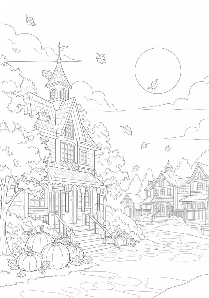 This is the page I would pull out for a long, unhurried evening when I really want to lose myself in something truly detailed and rewarding. I love a good architectural coloring page because there are so many decisions to make, like what color to paint the house, how to handle the roof, whether to make the sky a warm golden dusk or lean into something moodier and more dramatic with the full moon already right there waiting. The pumpkins in the foreground are a great warm-up area before you tackle the bigger sections, and working through all the little window details on the houses is genuinely so satisfying. If you enjoy pages that feel like a proper coloring project rather than a quick session, this one is absolutely calling your name.
