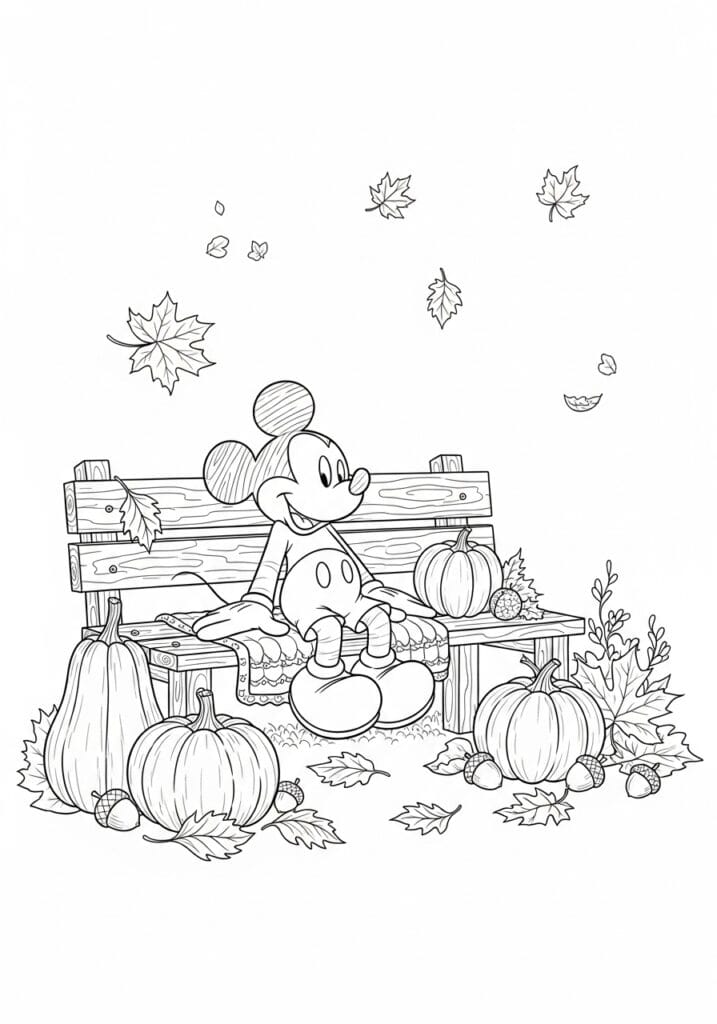 Mickey Mouse Relaxing on a Wooden Park Bench Surrounded by Pumpkins