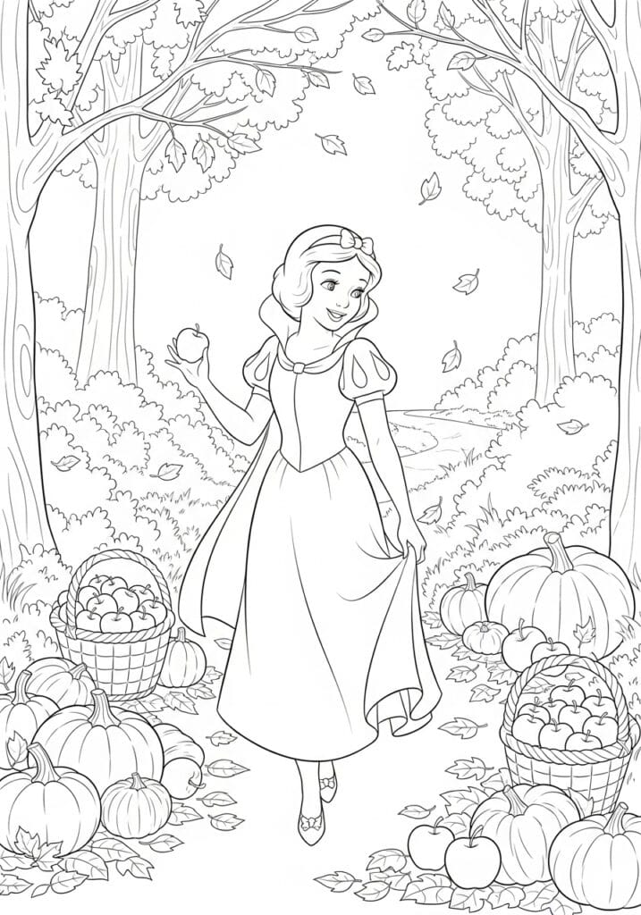 Snow White Gathering Apples and Pumpkins in an Autumn Forest