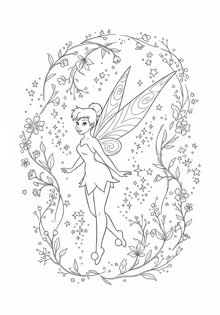 I personally think this page is an absolute dream to color because it gives you so many different textures to play with all in one layout. You can go bold and vibrant on Tinkerbell herself and then use softer, more muted tones for the botanical border to create that gorgeous contrast. The fairy dust and star details are my favorite part because they let you get creative with metallics or glitter gel pens without it looking overdone. It is the kind of page that feels both relaxing and exciting at the same time, which honestly is the sweet spot for a really satisfying coloring session.