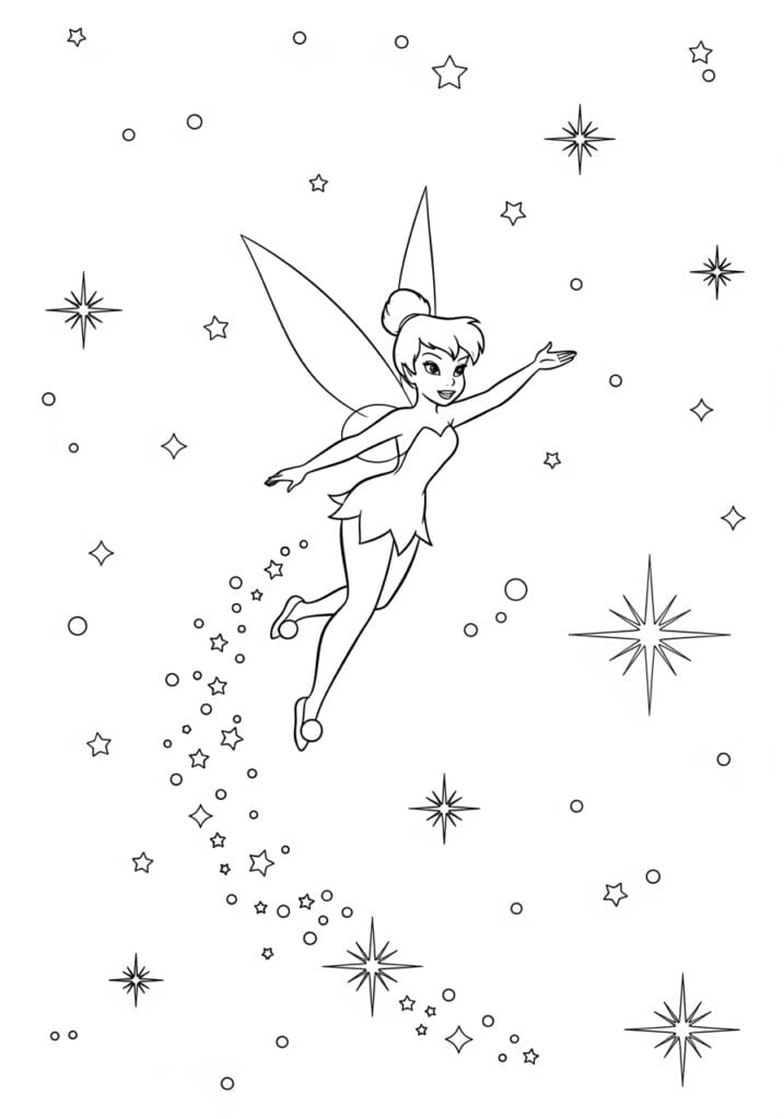 This page is pure joy in coloring page form and I just love how light and expansive it feels. Tinkerbell is positioned slightly left of center on the page, mid-flight with her arms outstretched and one leg kicked back behind her, radiating that carefree energy she is so famous for. A trail of fairy dust made up of tiny stars and circles cascades down from her feet toward the lower left corner of the page in a really natural and flowing way. All around her the rest of the page is filled with an airy scattering of stars in different sizes, large multi-pointed sparkle stars, small outline stars, and simple circles that are spread generously across the entire composition. The line work is clean and simple with smooth medium-weight outlines on Tinkerbell and lighter, thinner lines for all the star and sparkle details throughout.