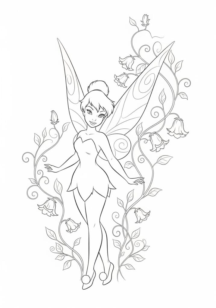 This design has such a graceful and romantic quality to it that honestly feels more like fine illustration art than a typical coloring page. Tinkerbell stands tall and confident right at the center of the page in a relaxed but poised stance, with her large elegant wings spreading out behind her and decorated with delicate swirl and teardrop details. Framing her on both sides are beautifully drawn vines that curl and twist their way up and around the entire composition, adorned with drooping bellflower blossoms, small rosebuds, and scattered leaves at every turn. A sweet little heart shape sits at the very top of the right vine, adding the most adorable romantic touch to the overall design. The line work throughout is fine and graceful, with particularly lovely thin lines used for the vines and floral elements that give the whole page a really elegant and delicate feel.