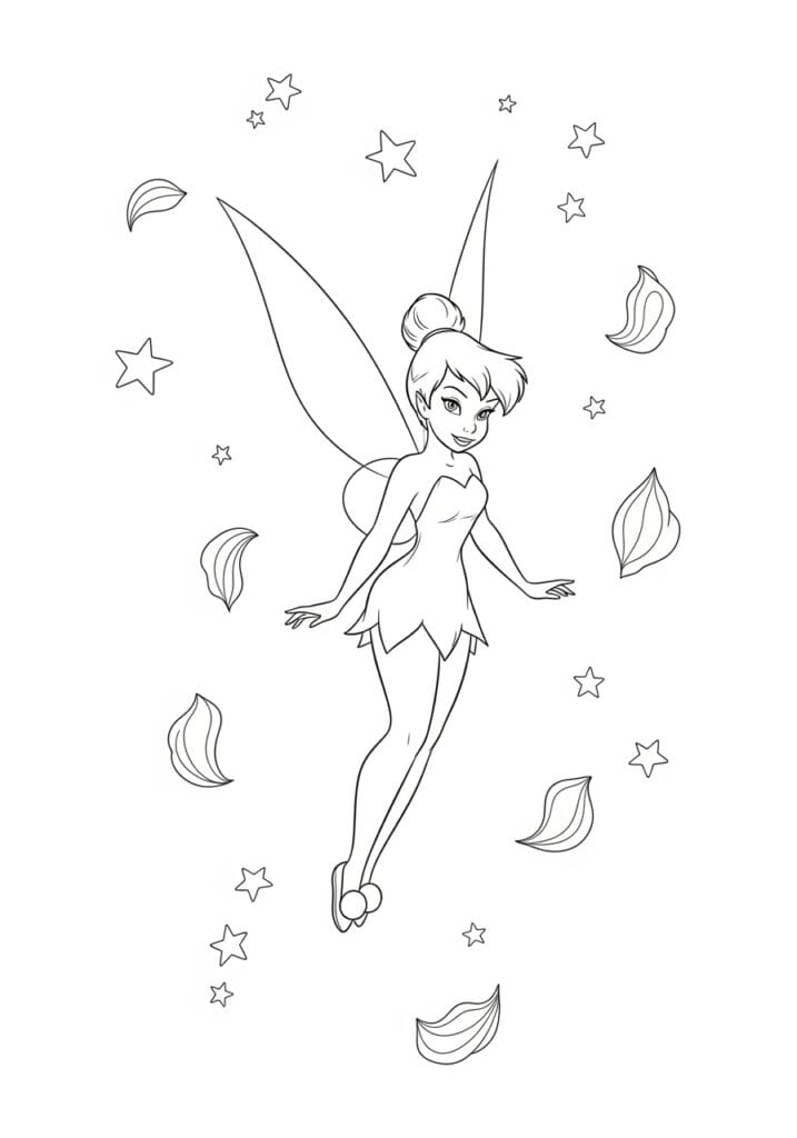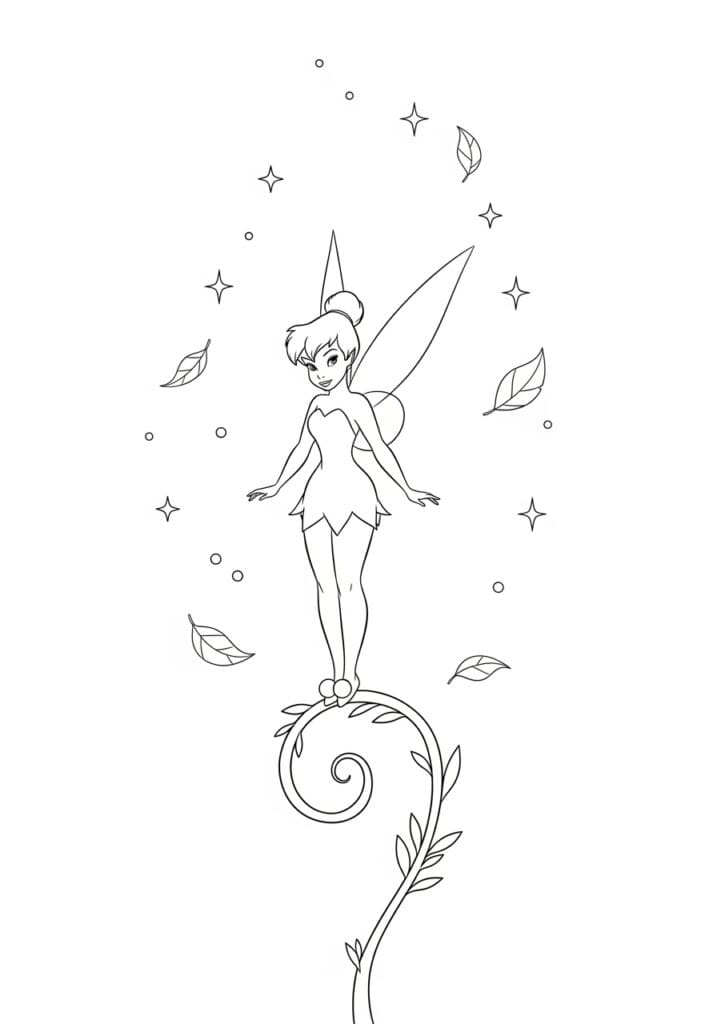 I find this page genuinely charming to color precisely because of how simple and open it is, and I mean that as the highest compliment. The minimalist layout means you can really focus on getting Tinkerbell herself looking absolutely beautiful without feeling rushed or overwhelmed by background detail. I personally love the idea of adding a very soft watercolor-style background wash in a pale mint or sky blue to give the white space some life while keeping the overall mood light and airy. The floating leaves are also a lovely little opportunity to practice color variation, and I would mix warm golden yellows with soft greens to give them that just-falling-from-the-tree feeling. Simple, sweet, and genuinely lovely.