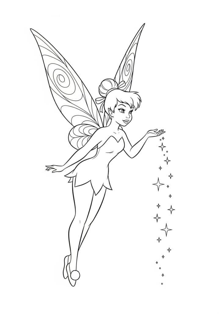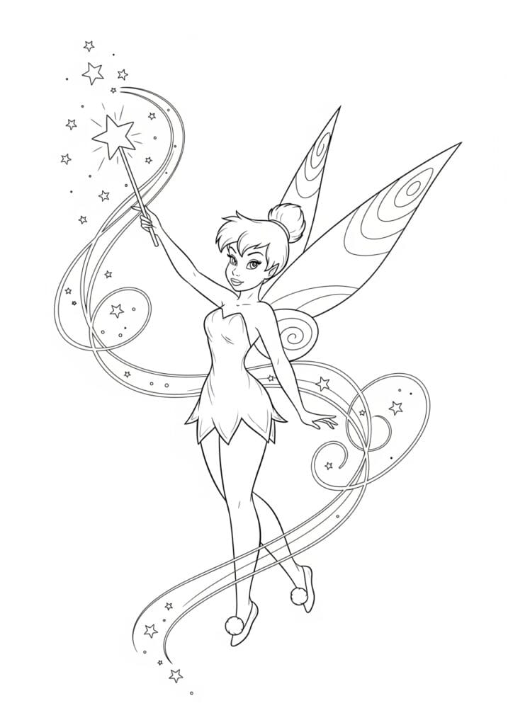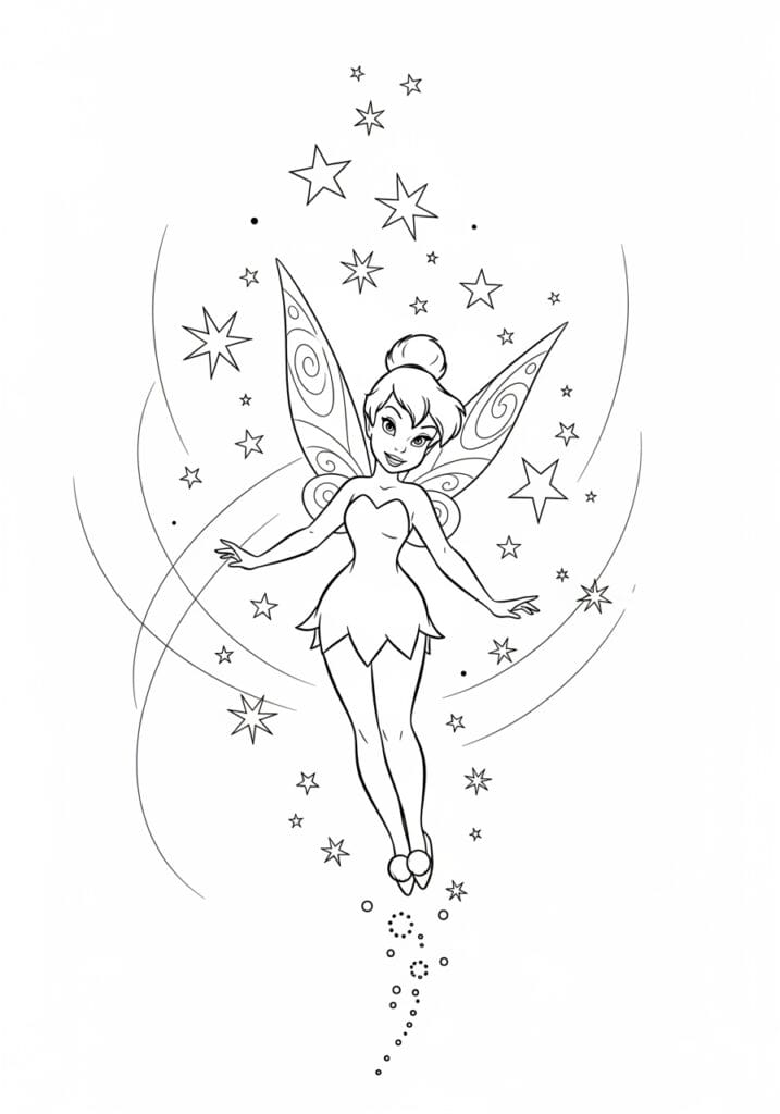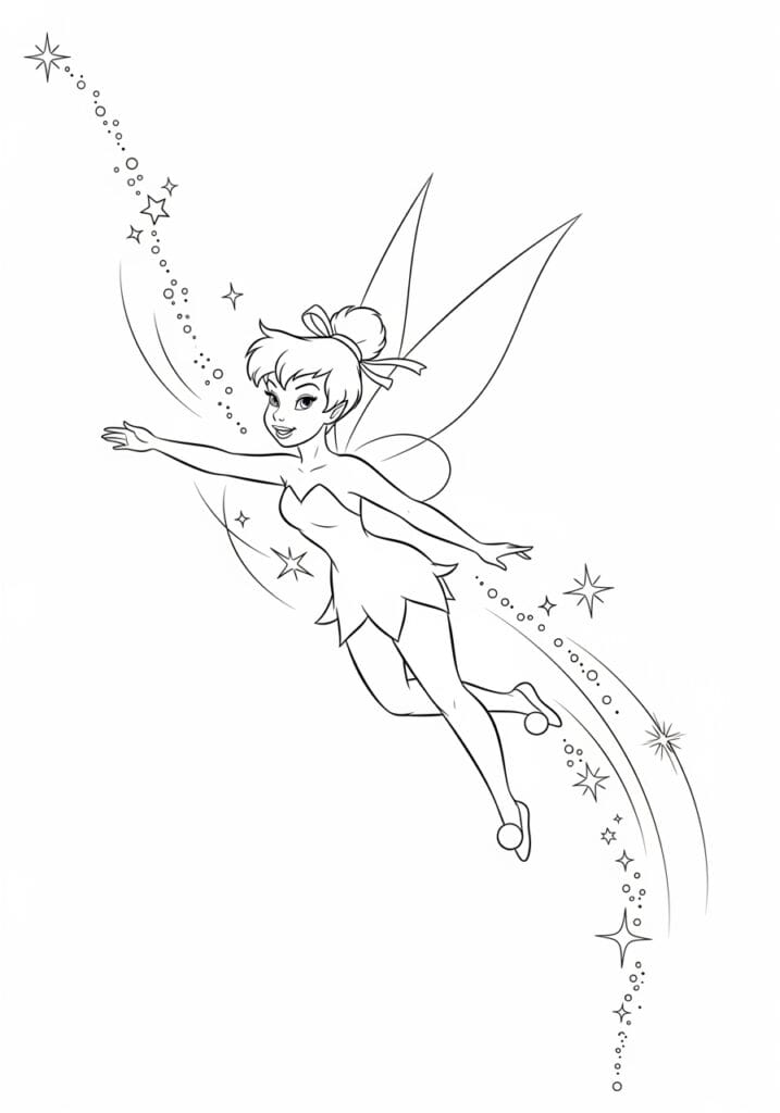 What I find so refreshing about this page is how uncluttered and dynamic it feels compared to busier designs. The focus is almost entirely on Tinkerbell and the movement around her, which makes it a wonderfully relaxing page to color without feeling too simple or boring. I would personally use a gradient background wash in soft sky blues and lavenders to fill in the white space and really make those stardust trails pop. The four-pointed stars scattered along the arcs are perfect for gold or silver gel pen details, and I think keeping Tinkerbell in her classic warm tones against a cool background would look absolutely stunning. This one is pure coloring therapy.