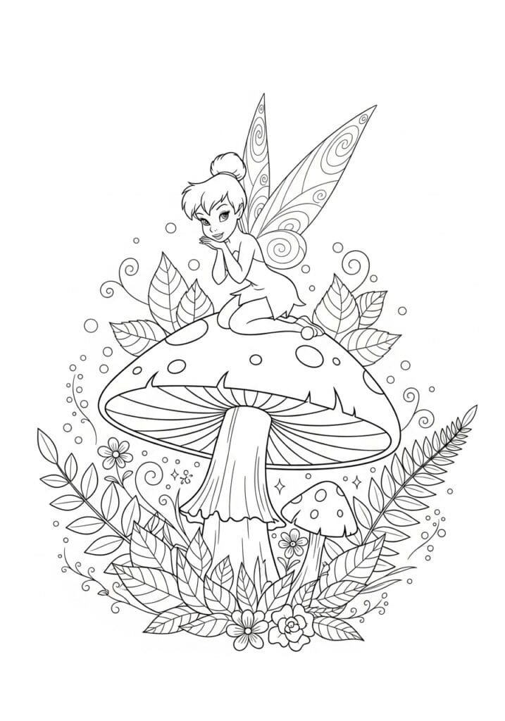 This page is giving full cottagecore fairy energy and I am completely here for it. Tinkerbell sits perched on top of a large toadstool mushroom with her chin resting in her hand, looking like she is deep in thought about some very important fairy business. The mushroom itself is beautifully detailed with radiating lines under the cap and round spots on top, and a smaller mushroom peeks out from behind the stem at the base. The entire lower half of the design is filled with a lush arrangement of layered leaves, ferns, small wildflowers, and curling botanical swirls that create a really rich and immersive forest floor scene. Floating bubbles and tiny sparkles dot the space around Tinkerbell, and her wings are covered in gorgeous spiral and swirl patterns that add a lovely decorative element to the upper half of the page.