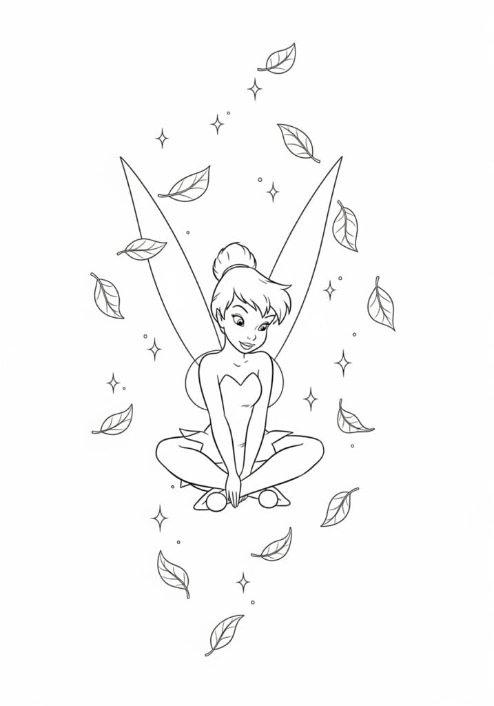 There is something so quietly beautiful about this design that honestly made me stop and smile the moment I saw it. Tinkerbell is seated cross-legged in the center of the page in a relaxed and contemplative pose, with her large elegant wings spread open behind her in a simple V shape that frames her perfectly. Scattered all around her in every direction are gently falling leaves of varying sizes, each one lightly detailed with a central vein and simple curved lines. Four-pointed sparkle stars are dotted throughout the composition alongside tiny circles, giving the whole scene a calm and magical atmosphere. The line work is clean and minimal with smooth, medium-weight outlines that keep the design feeling open and uncluttered.