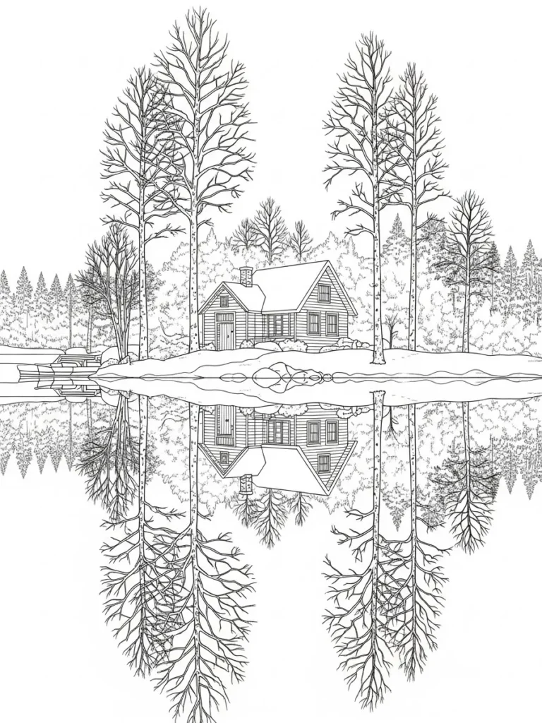 This coloring page features a cozy wooden cabin tucked among tall bare winter trees beside a calm lake, all drawn in clean black and white line art. The scene is beautifully balanced with a mirror like reflection in the water that doubles the trees and cabin for a soothing symmetrical layout. Fine detailed lines shape the tree branches, forest textures, and cabin siding, while softer open spaces in the snow and water keep the design from feeling overwhelming. The overall composition feels quiet and spacious, with lots of intricate areas to enjoy alongside restful breathing room.