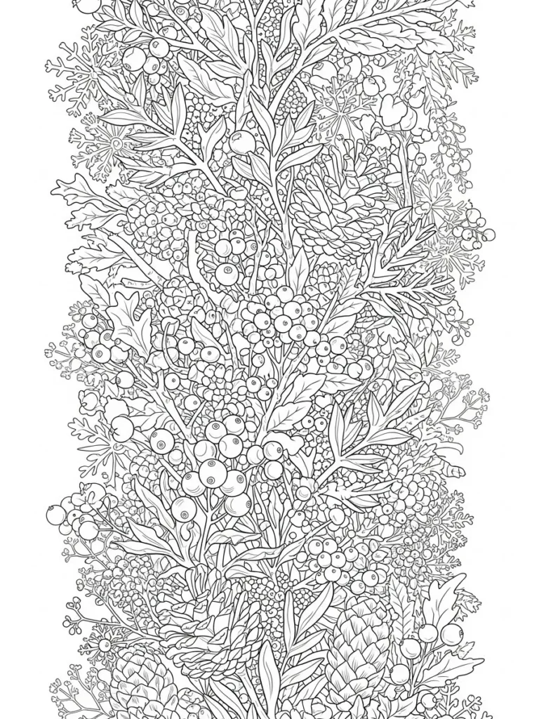 This coloring page is packed with lush winter botanicals layered from top to bottom in a tall flowing arrangement. Pinecones, clusters of berries, leafy branches, and delicate winter foliage weave together in a dense yet beautifully balanced design. The line work is fine and detailed, with repeating shapes and overlapping elements that create rich texture without feeling chaotic. Everything feels organic and cozy, like a winter garland gathered straight from the forest.