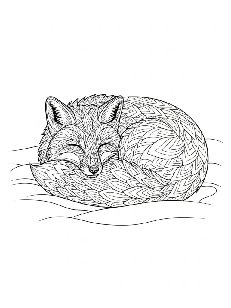 This coloring page features the most adorable little fox curled up for a snuggly winter rest. Its entire body, including its bushy tail that wraps around like a warm blanket, is filled with beautiful, intricate line work that looks almost like delicate overlapping feathers or stylized leaves. The lines vary slightly in thickness which adds a nice depth to the zentangle-inspired fur texture. The sleeping fox is resting on what looks like gentle snow drifts, sketched with simple, soft curving lines that keep the focus entirely on our sleepy woodland friend.
