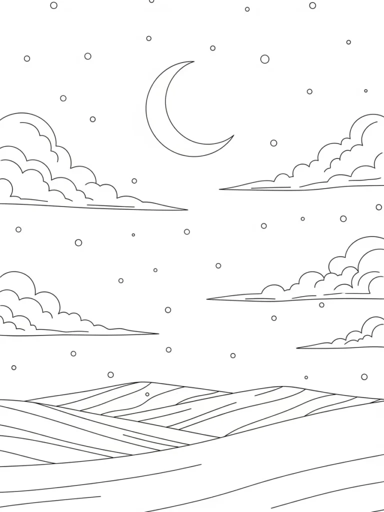 This coloring page offers a wonderfully minimalist yet atmospheric winter night scene. The composition balances large open spaces of sky with grounding elements below. A perfectly smooth crescent moon hangs high among scattered, simple circular shapes representing falling snow or stars. Layered, stylized clouds with softly rounded edges drift across the sky in distinct bands. Below, the landscape is suggested by broad, gently undulating hills marked with clean, parallel lines creating a restful pattern suggesting smooth snow cover. The overall look relies on clear, medium-thickness outlines for a very clean and modern feel.