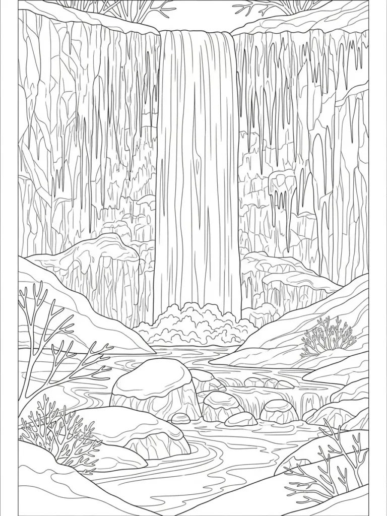 This coloring page presents a dramatic and lush winter scene dominated by a massive waterfall cascading down a cliff face. The sheer rock walls surrounding the waterfall are textured with detailed vertical lines suggesting rugged stone and many long, delicate icicles hanging down, adding a beautiful icy motif. In the foreground, a stream winds its way through large, snow-dusted boulders and around clumps of bare, twiggy winter shrubs. The line work is quite detailed, especially in the rocky textures and the intricate flow lines of the water at the base.