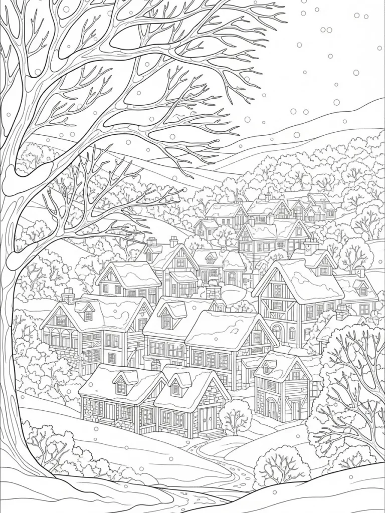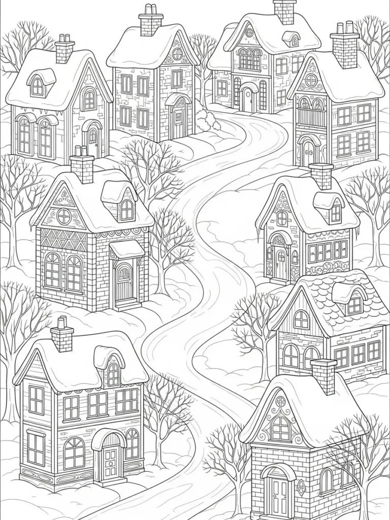 This coloring page is just fantastic for when I want to spend a long, cozy afternoon coloring. There are so many individual elements that I can color each house a completely different color scheme if I want to, making it feel like a vibrant, colorful little town despite the snow. I love planning out the tiny details on the window frames and door arches. If you enjoy detailed architecture and creating warm, inviting atmospheres, this one will keep you happily occupied for hours. It truly sparks the imagination and makes me want to brew a big cup of spiced tea while I color.