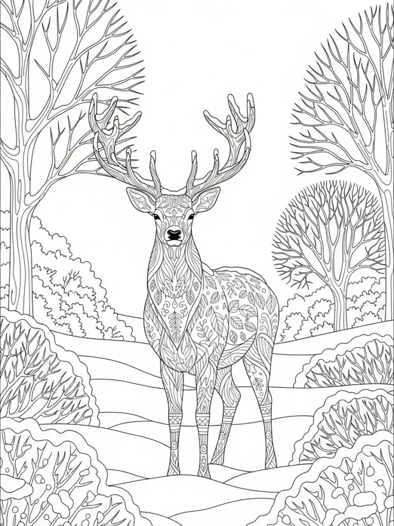 This beautiful coloring page features a magnificent stag standing proud and centered in a snow-dusted forest clearing. The absolute highlight is the stag itself, whose body is completely covered in stunning zentangle-style patterns featuring intricate leaves and flowing natural motifs. Its grand antlers are also filled with similar flowing designs, giving it a truly magical appearance. The background shows simple, sweeping lines for the snowy ground and several bare winter trees with delicate, fine branches creating a lovely frame for our noble centerpiece. The line work is generally clean, with higher detail concentrated solely on the deer.